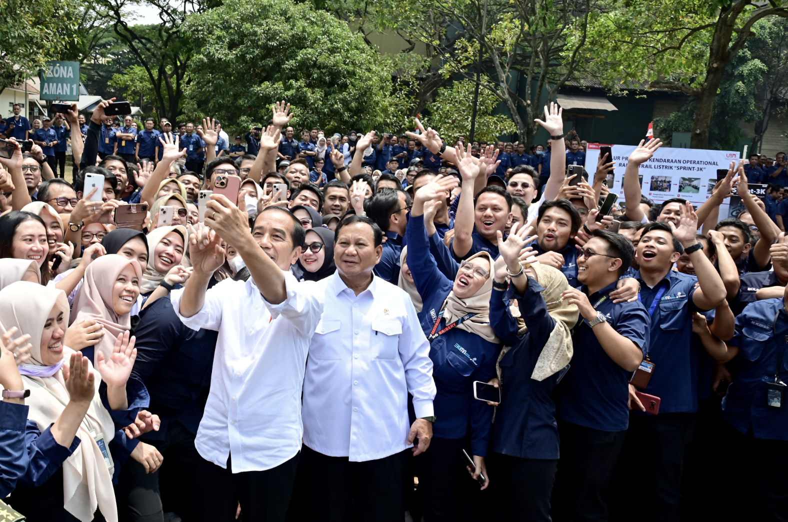 Dalam momen tersebut, Jokowi dan Prabowo yang kompak mengenakan baju kemeja putih panjang, berdiri di depan barisan para karyawan PT Pindad.